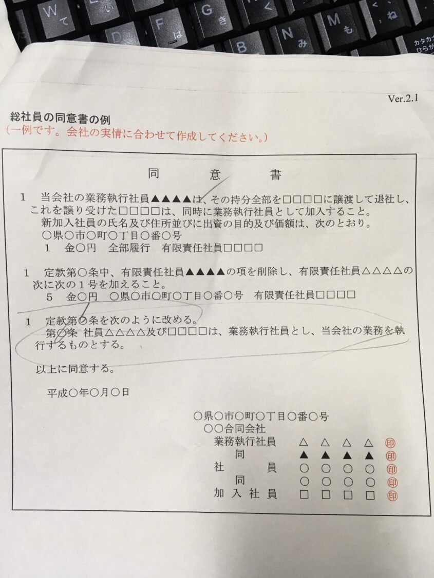 次に新規加入者を合同会社と言う法人が受け入れるかどうか?の決議が必要になります、ひとり会社の場合ピンときませんがルールはルールと言うことで、新規加入者(妻)を受け入れる同意書を作成します。